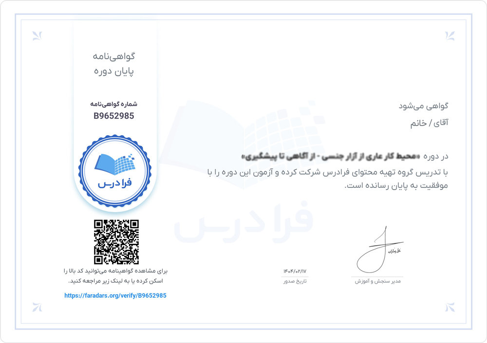 🔸 فقط گواهینامههای معتبر صادرشده از سوی فرادرس که در حساب کاربری شما در سایت فرادرس ثبت شده باشند، مورد تأیید هستند.